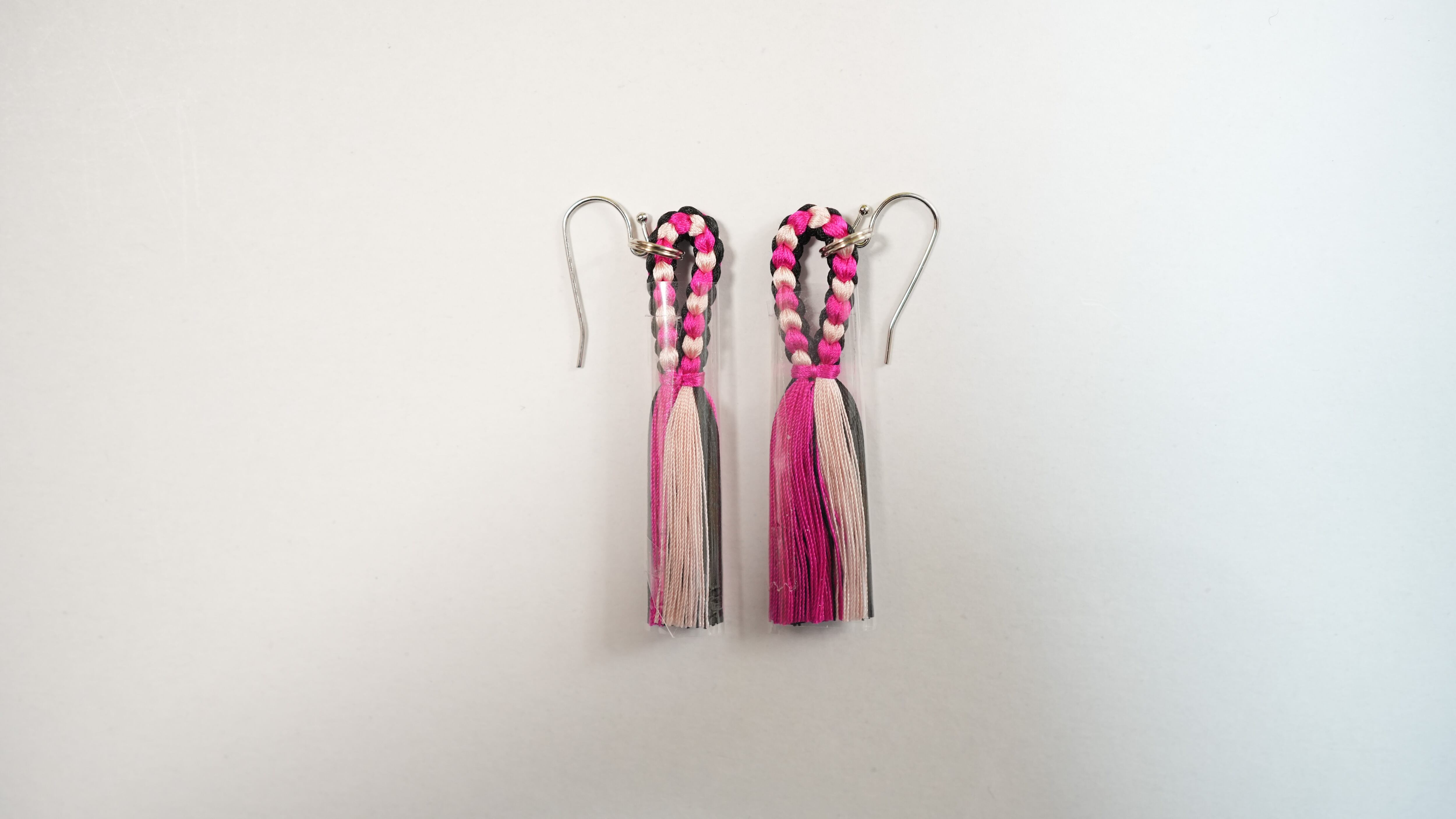 濃いピンク・薄いピンク・黒の絹糸を使用した、組紐のピアスです。