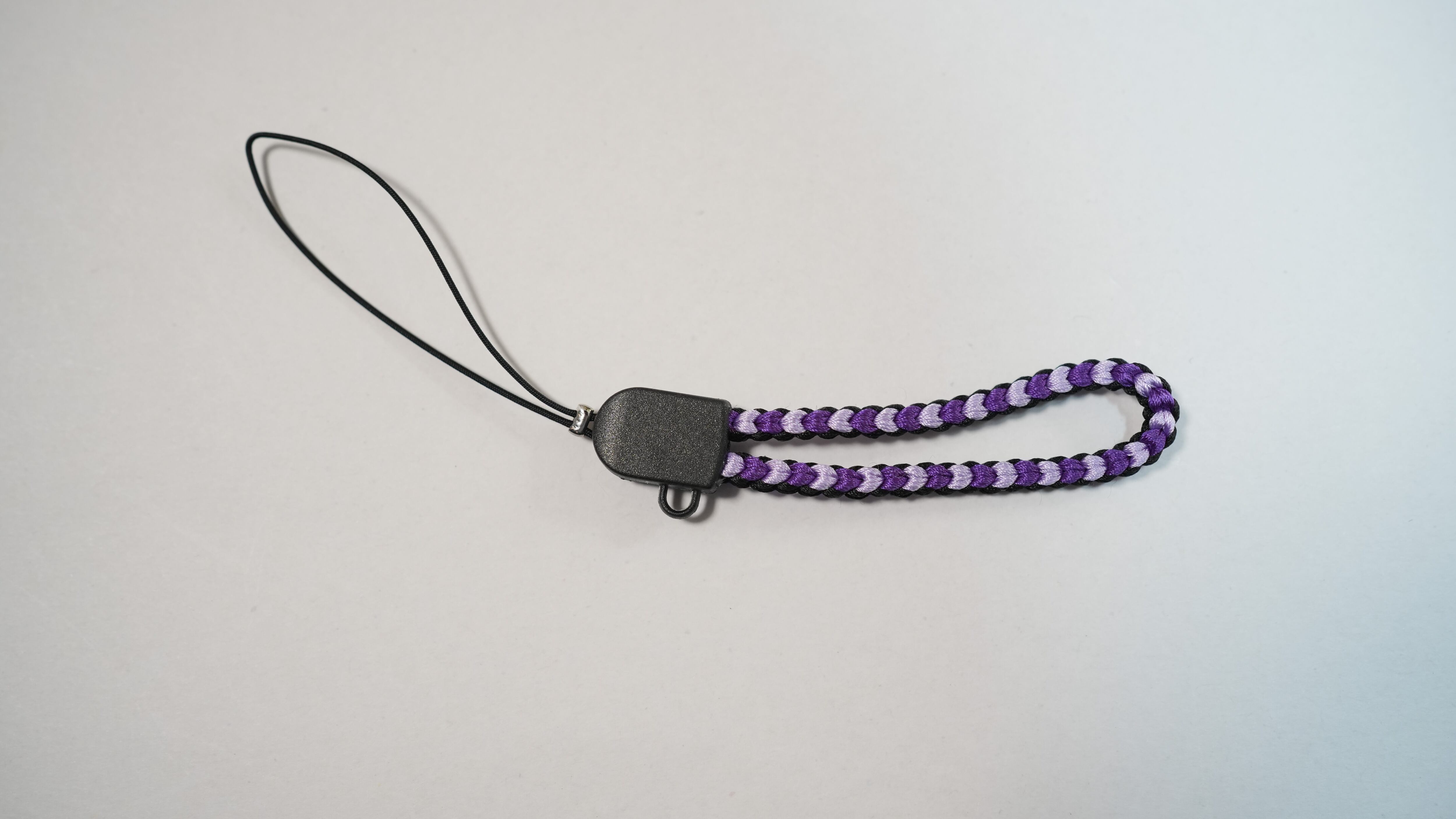 濃い紫・薄い紫・黒の絹糸を使用した組紐のストラップです。