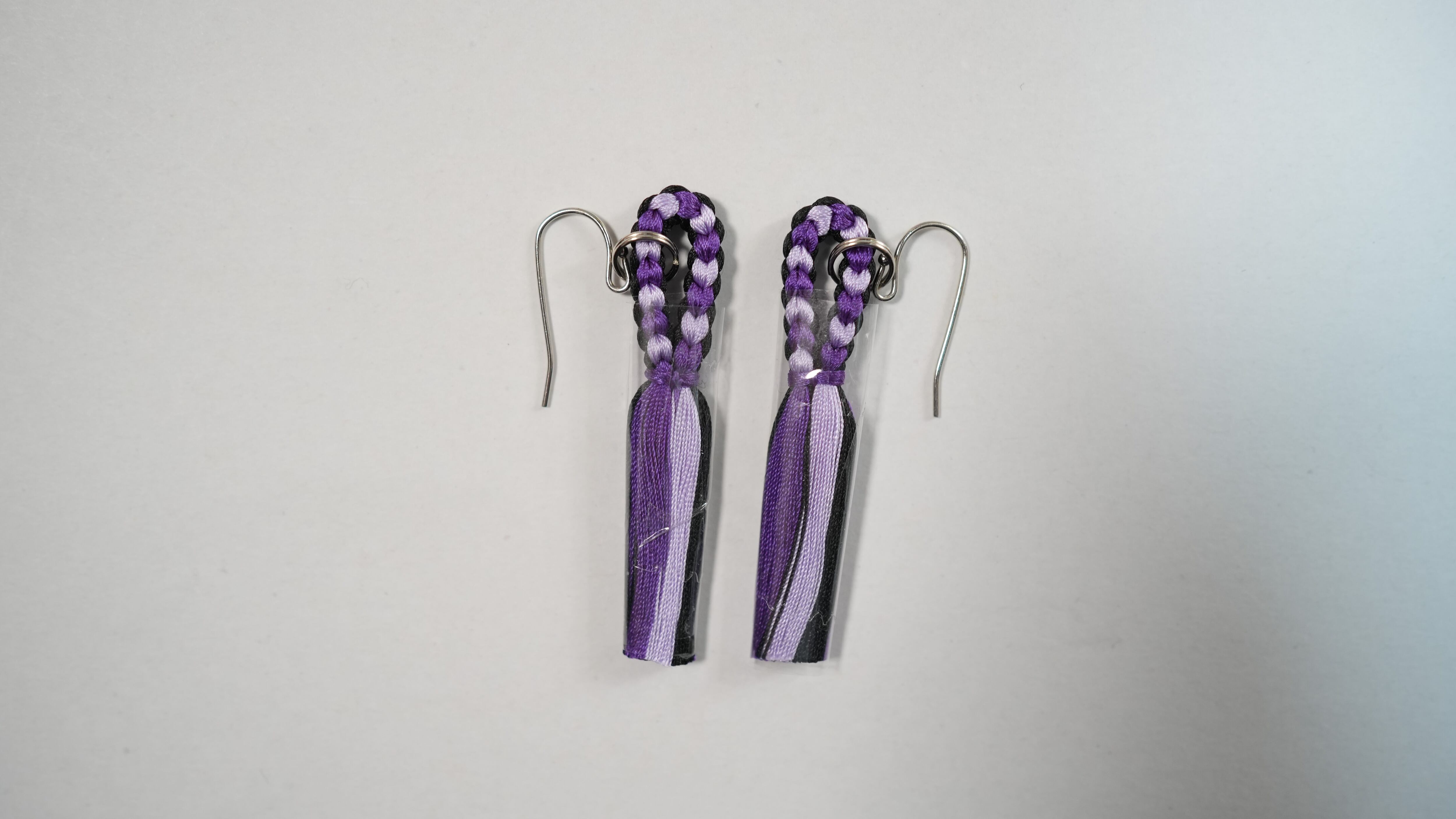 濃い紫・薄い紫・黒の絹糸を使用した、組紐のピアスです。