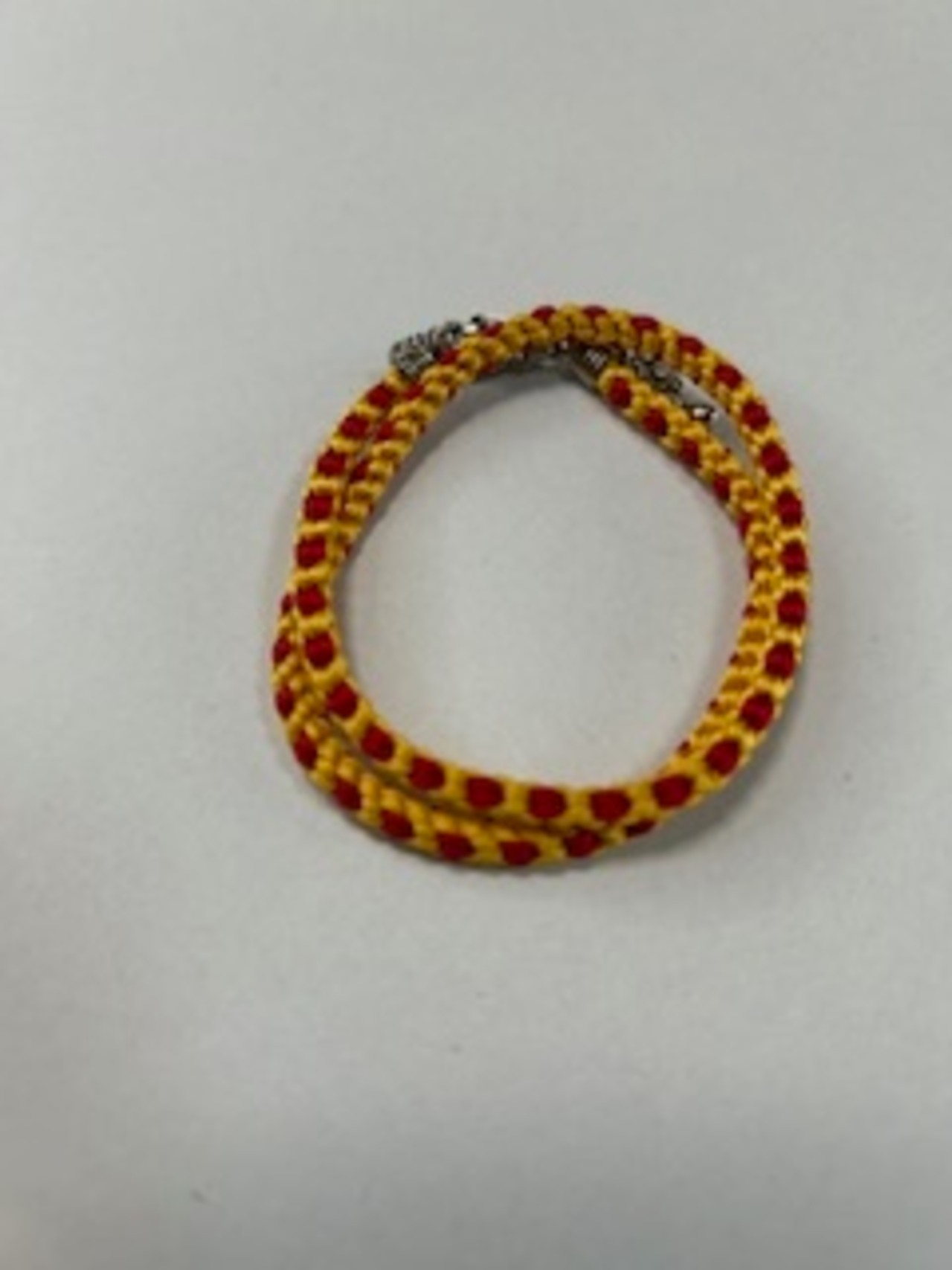 黄色・赤の絹糸を使用した、手首に2周巻き付けるタイプの組紐ブレスレットです。