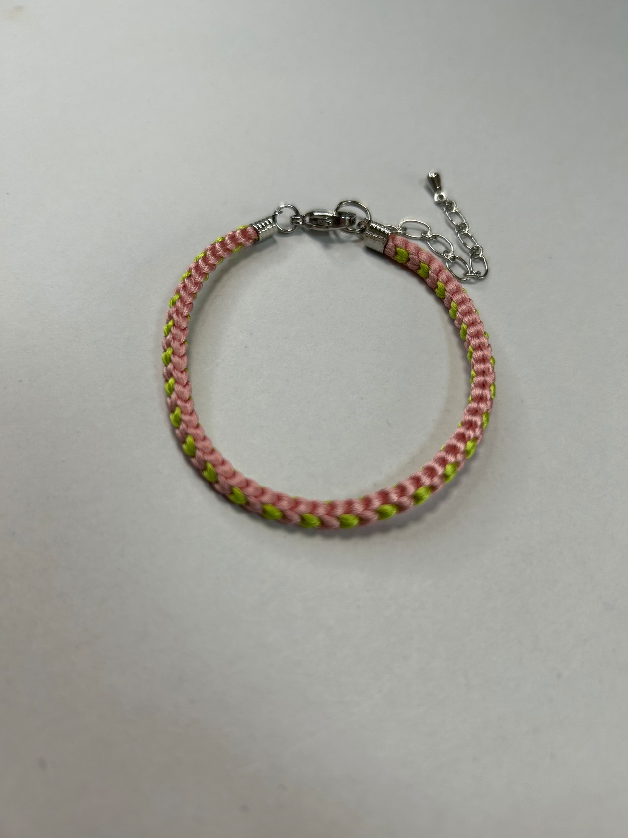 ピンク・黄緑の絹糸を使用した、一重タイプの組紐ブレスレットです。