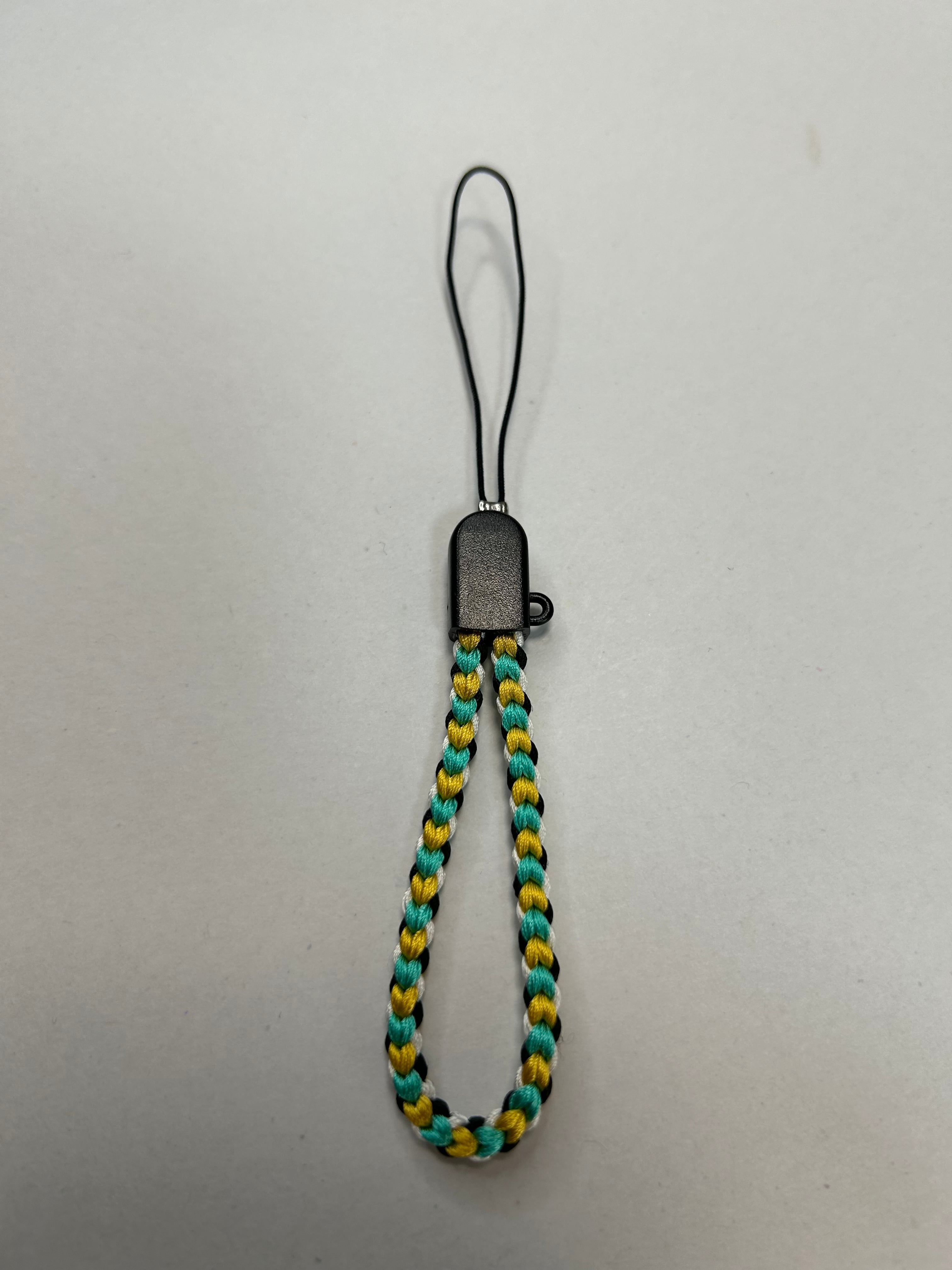 白・黒・黄色・緑の絹糸を使用した組紐のストラップです。