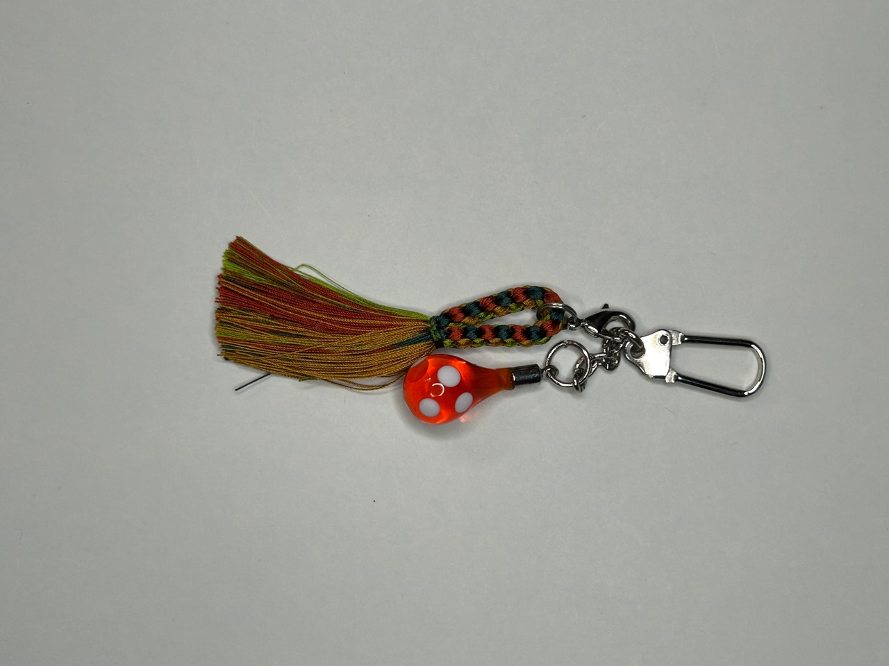 黄緑・深緑・薄いオレンジ色・濃いオレンジ色の絹糸を使用した組紐に、オレンジのトンボ玉が付いたキーホルダーです。