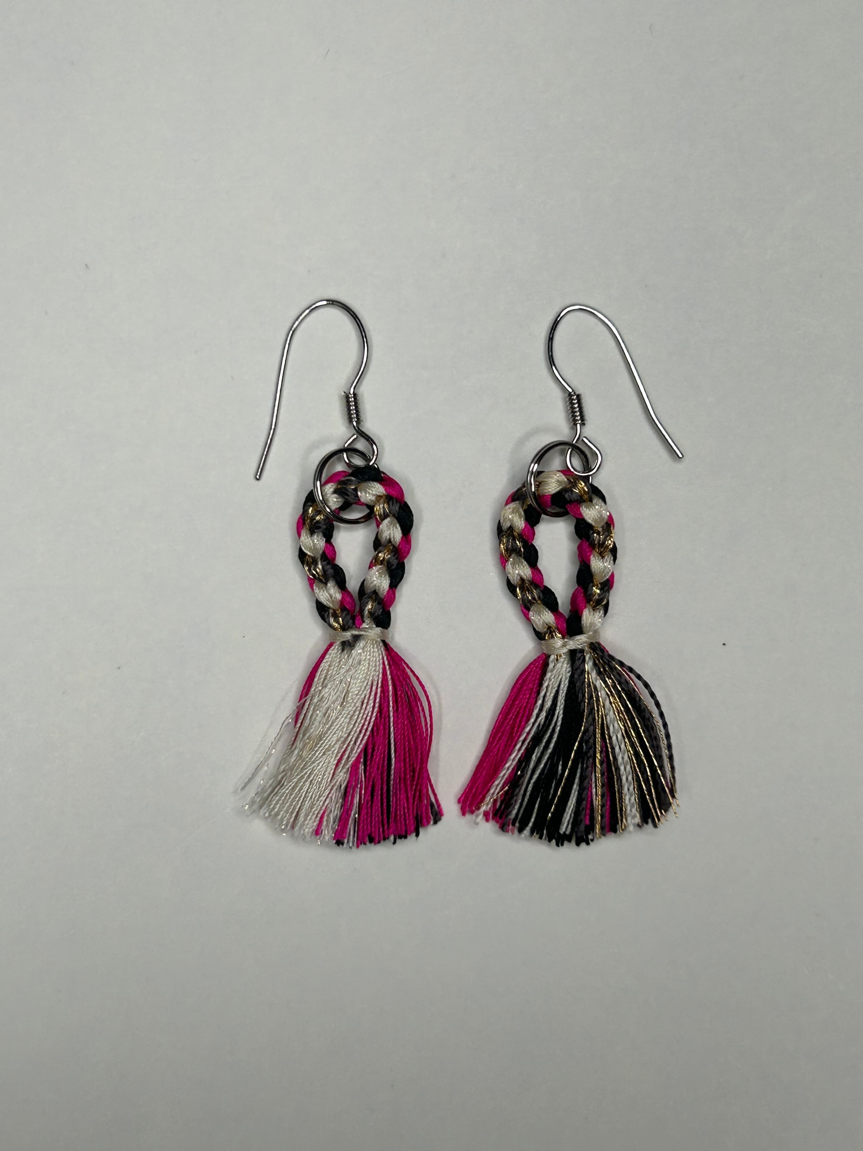 白・金糸入りのグレー・黒・ピンクの絹糸を使用した、組紐のピアスです。