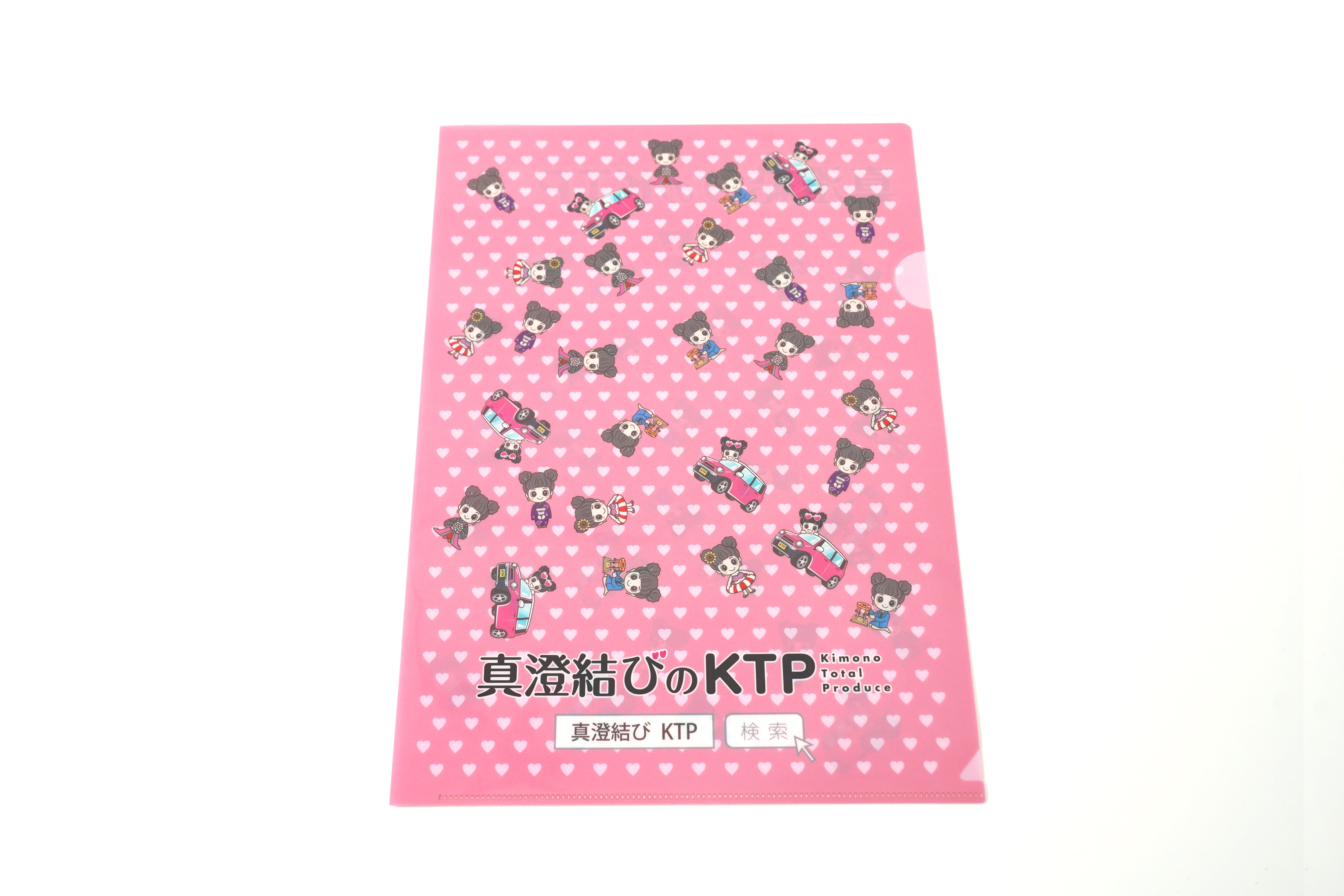 ピンクのハート柄の背景に、KTPのマスコットキャラクター・真澄ちゃんが様々な衣装で描かれているA4サイズのクリアファイルです。