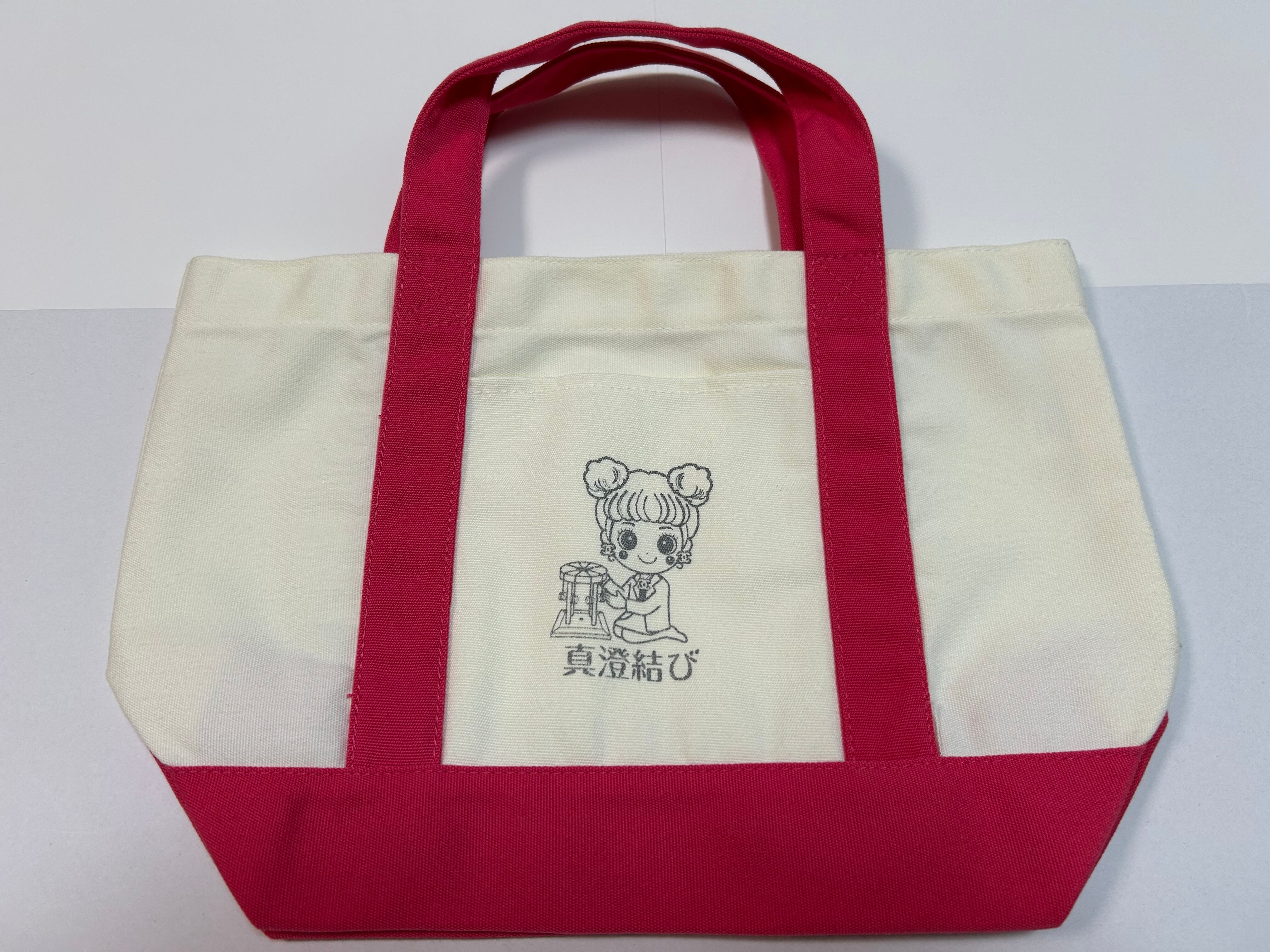 白地に、取っ手と底部分には濃いピンク色の生地を使用したマチ付きのトートバッグで、片面には真澄ちゃんのイラストがプリントされています。
