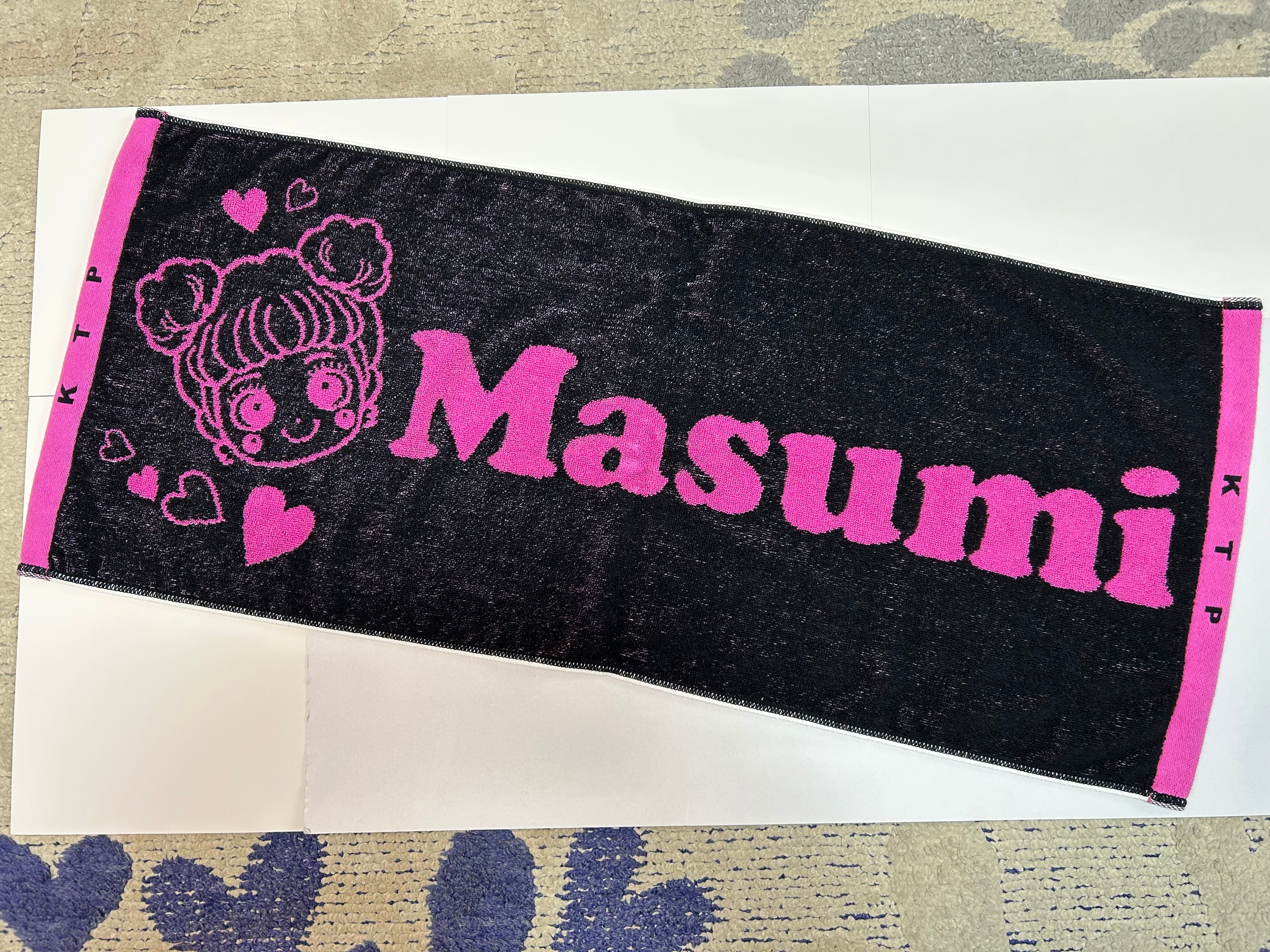 黒色を背景に、濃いピンク色で真澄ちゃんの顔と名前が刺繍された、大きめの今治タオルです。